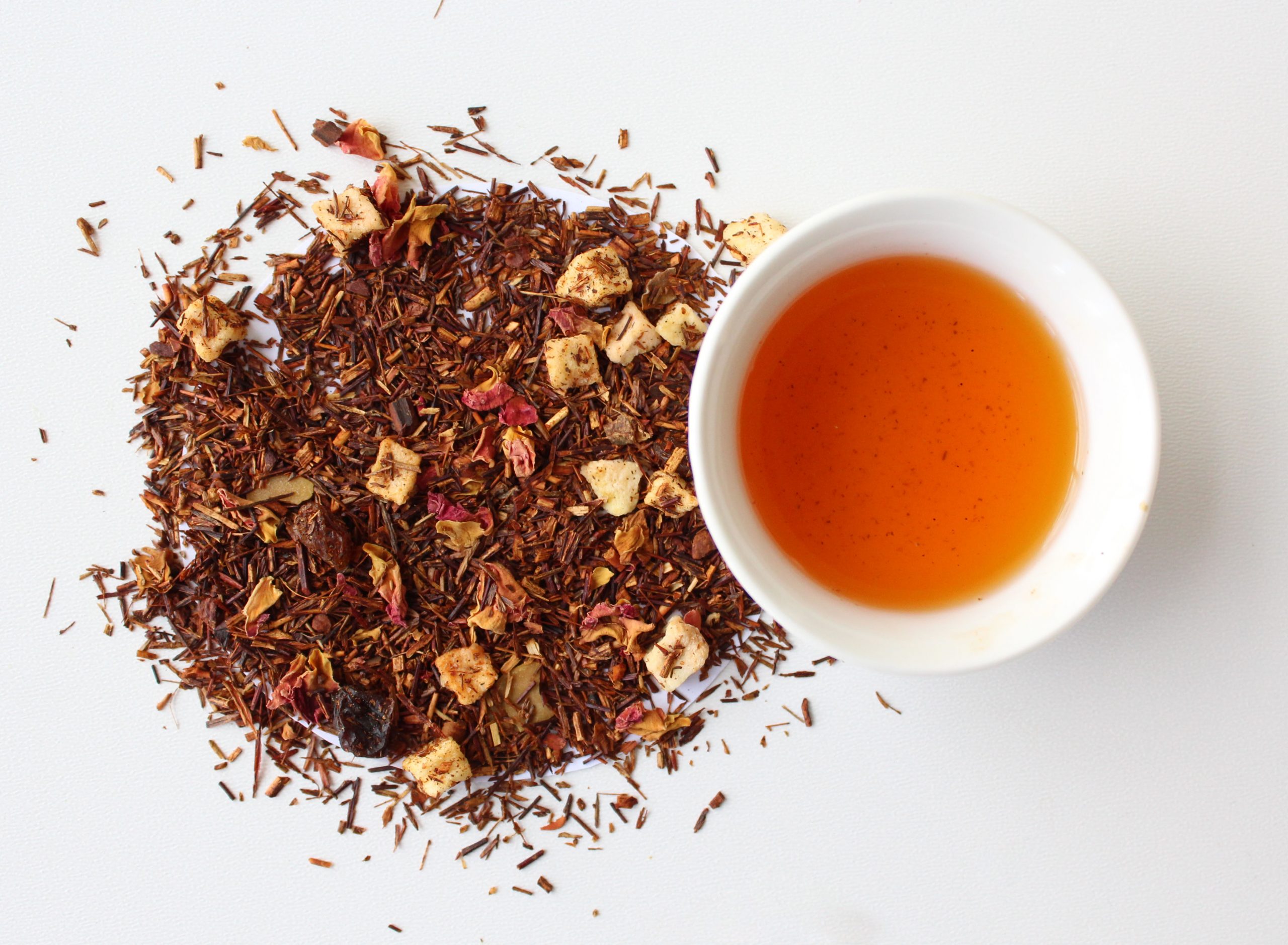 Rooibos, Appel stukjes, Rozijnen, Aroma, Rozenblaadjes, Kaneel, Amandel, Vanille
