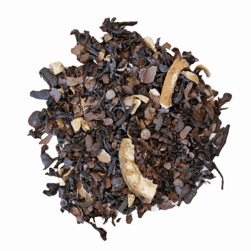 Pu Erh (50%), Cacao-shells, Sinaasappelschil, Sinaasappel Granulaat, Chocolade Druppels, Oranje Bloesems, Natuurlijk Aroma