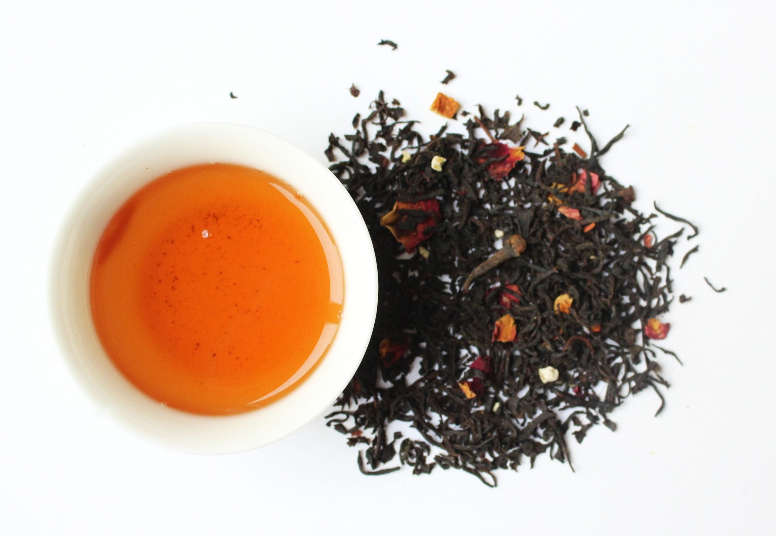 Zwarte kruidige kerstthee met sinaasappel, stukjes amandel en vanille. Een fijne thee om bij weg te dromen en een goede opwarmer.