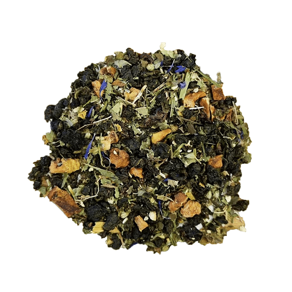 Oolong thee, Appel, Citrusschil, Citroenverbena, Duizendblad, Zoet Braamblad, Natuurlijk Aroma, Gerstegras, Korenbloemblaadjes, Grapefruit, Zonnebloemblaadjes