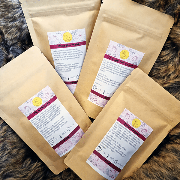 Stap in een kleurrijke fantasie wereld met dit mooie thee pakket. We nemen je mee het fantasy dierenrijk in met de Green Dragon thee, een heerlijke blend met groene appel en papaja. Vervolgens bezoeken we de Pink Unicorn die je blij maakt met witte chocola en frambozen, een roze blend gegarandeerd. Dan duiken we de zee in, op zoek naar de Blue Mermaid; een spannende blauwe blend met aloë vera en zwarte bes. Dan sluiten we af bij de fee die ons betoverd met haar Orange Fairy Dust, een oranje blend van sinaasappel en ananas. Echt een Colorful Fantasy Pakket!