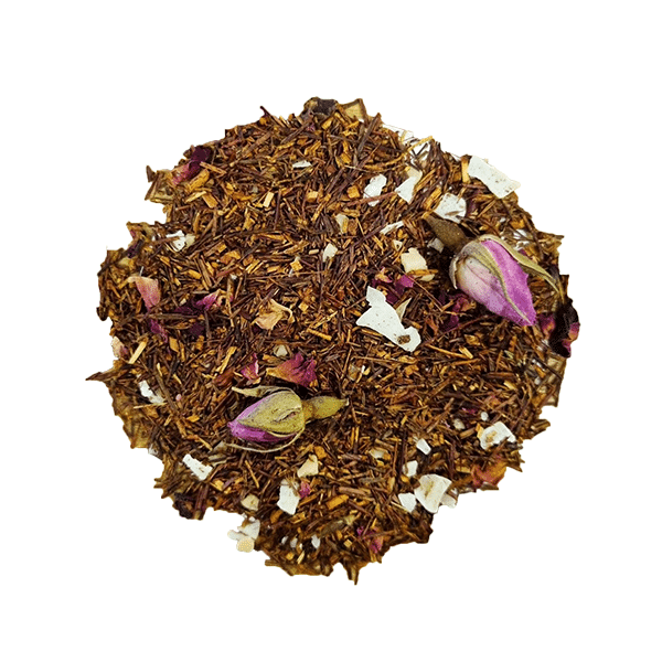 Rooibos, Amandelen (8%), Aroma, Rozenknopjes, Kokoschips, Rozenblaadjes