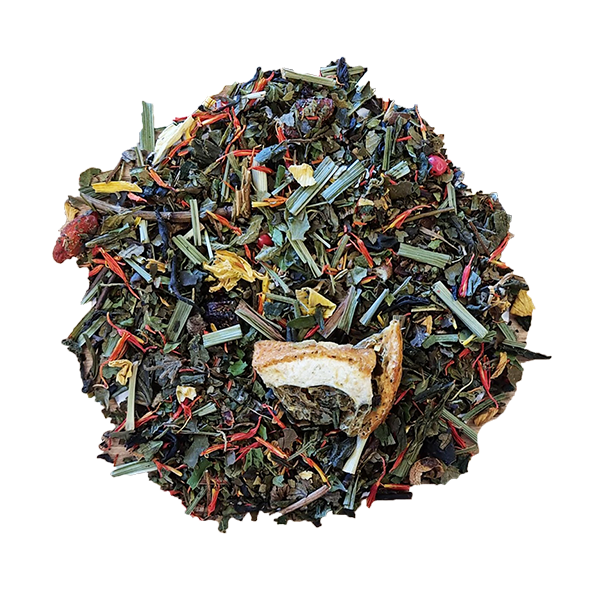 Braamblad, Groene thee, Brandnetel, Rozenbottel, Citroengras, Pepermunt, Zwarte thee, Sinaasappel, Gojibessen, Saffloer, Zonnebloem, Aroma, Roze Peperkorrels, Zoethout, Chilipeper