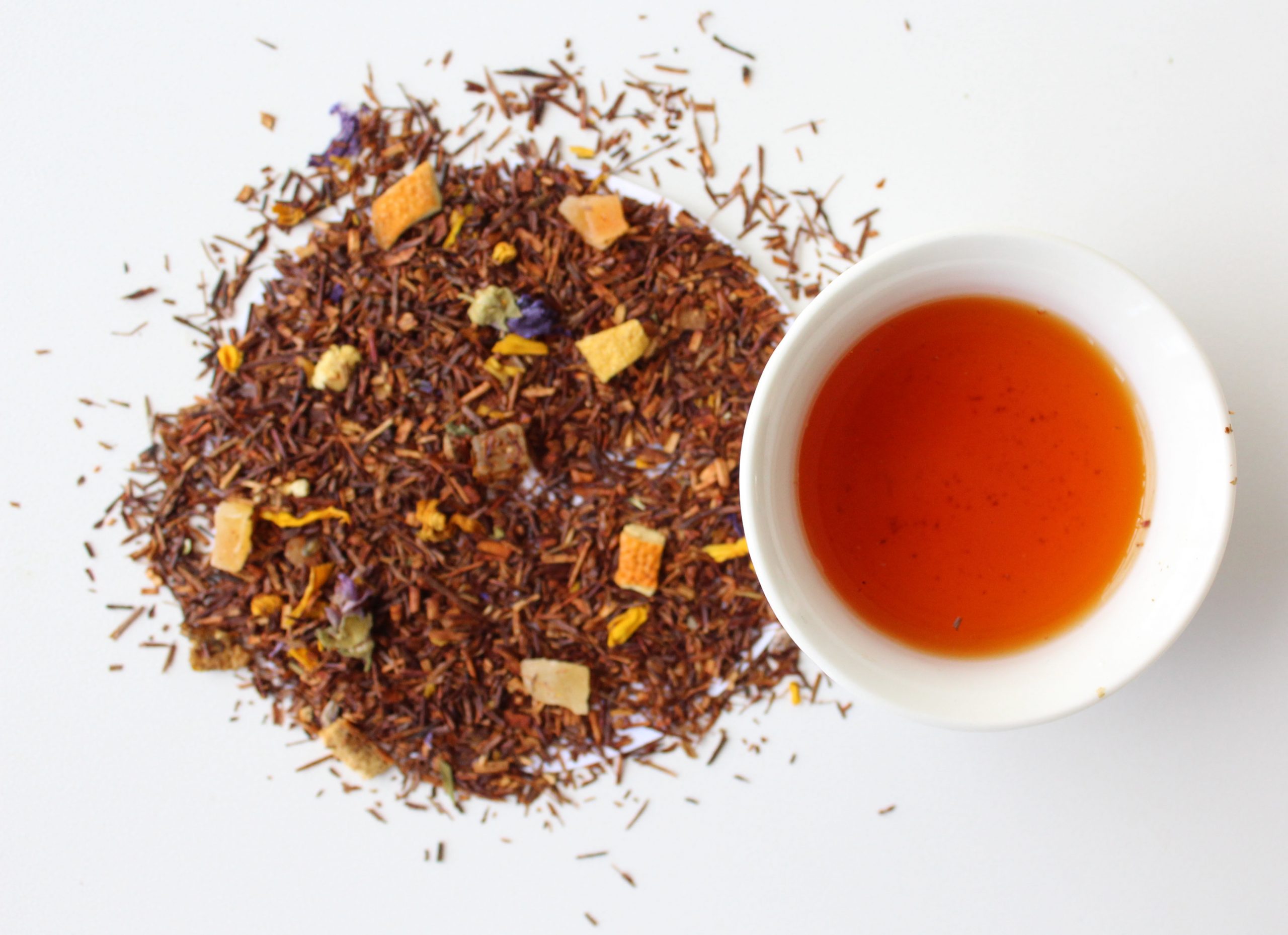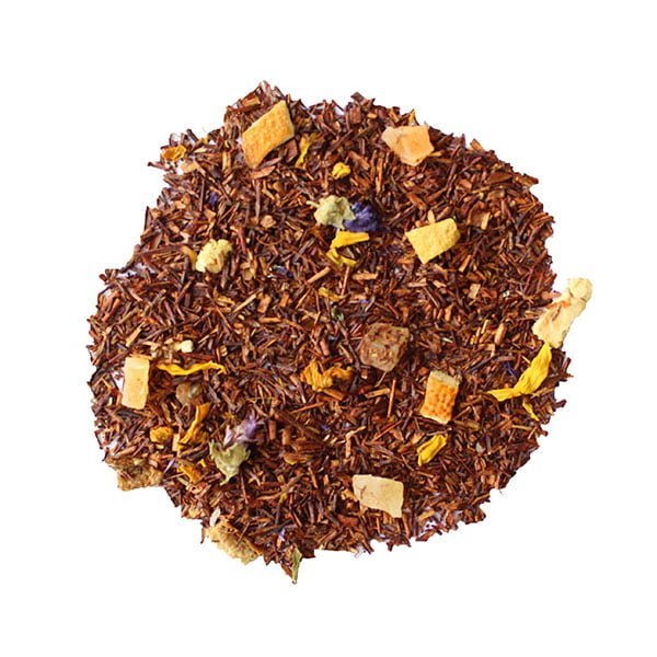Rooibos, Ananas stukjes, Aroma, Sinaasappelschil, Papaya stukjes, Mangobits, Zonnebloembloemen, Kaasjeskruid bloesems.