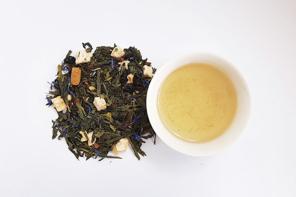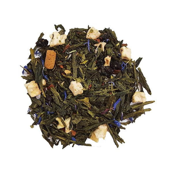 Groene thee, Appelstukjes, Krenten, Stukjes Marsepein, Kaneel, Aroma, Korenbloem