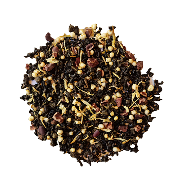 Groene Thee (82 %), Cacaobonen, Quinoa (5 %), Aroma‘s, Witte Korenbloemblaadjes