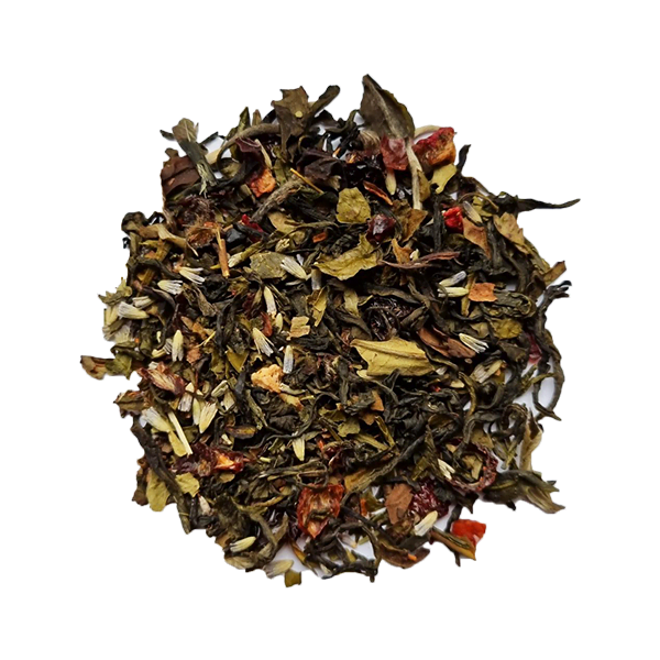 Witte thee Mao Feng* & Pai Mu Tan*, Rozenbottel*, Groene thee Sencha*, Natuur- lijk Aardbeienaroma, Lavendel*, Rooibos*, Natuurlijke Roomsmaak, Aardbei*.