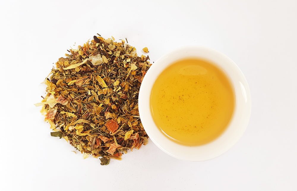 Groene Rooibos, Duindoorn bes, Ananas, Guave, Wortel, Aroma‘s, Zonnebloem bloesem, Natuurlijke Aroma‘s, Appelbes, Goudsbloem.